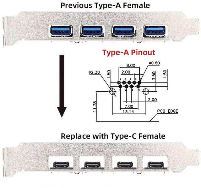 The Type-C female connector is replaced forUSB3.0 Type-A DIP Female.For DIY OEM use. You need to solder the connector yourself.
