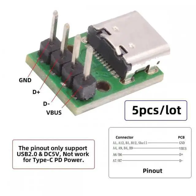 1. 5pcs/set DIY OEM Type C Female Socket Connector to 4Pin Pitch=2.54mm Contact Header Vertical USB2.0 Pinout DC 5V Power
