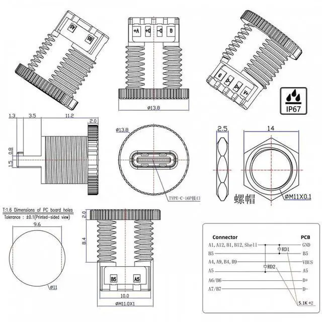 1. 5pcs/set DIY OEM Type C Female Socket Connector to 6Pin PCBA Pinout Scew Nut Mount Type DC 5V/20V PD Power