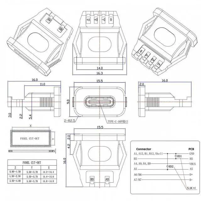 5pcs/set DIY OEM Type C Female Socket Connector to 6Pin PCBA Pinout Rectangle Latch Mount Type DC 5V/20V PD Power IP67