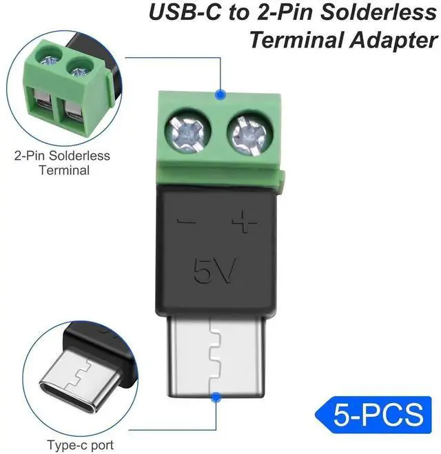 USB Type C Solderless Terminal AdapterThis USB-C male to 2-pin screw terminal adapter features a 5V voltage output and can extend the length of a USB-C cable. It is ideal for electronic DIY projects and testing devices with USB-C interface ports. DIY enthusiasts and maintenance personnel can quickly modify or repair USB-C charging cables with it.