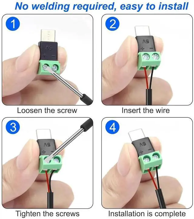 No welding designThis USB-C to 2pin screw terminal connector adopts a solderless design, which does not require soldering and is easy to use. Only a screwdriver is needed to easily complete the wiring, saving installation time and trouble, and making disassembly convenient.