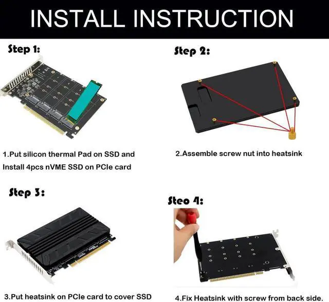 [Hardware requirement]1. There is available PCI-e 4.0 or 3.0 x16 Slot on Mobo; 2. Motherboard support PCIe x16 Bifurcation itself which can be set as"PCI-e x4x4x4x4" in BIOS; 3. CPU has enough channels to support