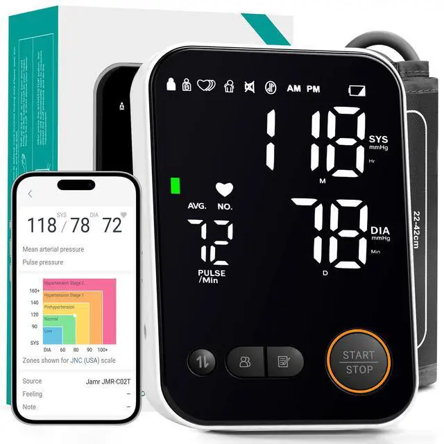 The Oklar digital blood pressure monitor measures blood pressure and heart rate fully automatically. Simply press the "Start" or "Stop" button for quick readings anytime.