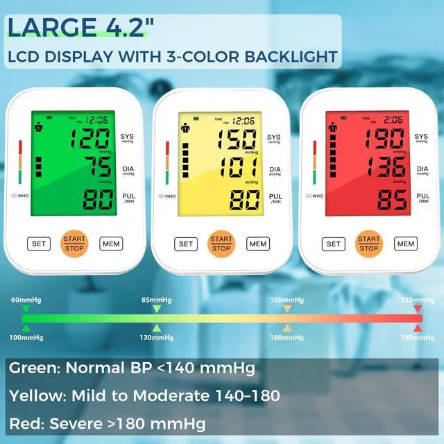 The extra-large 4.2" backlit screen gives you instant visibility at any angle, day or night. Our exclusive three-color backlight instantly classifies your readings by blood pressure risk level—green means healthy, yellow signals caution, and red alerts you to high pressure. It’s the perfect daily wellness gift for parents and loved ones, designed for easy use, quick results, and peace of mind at home.