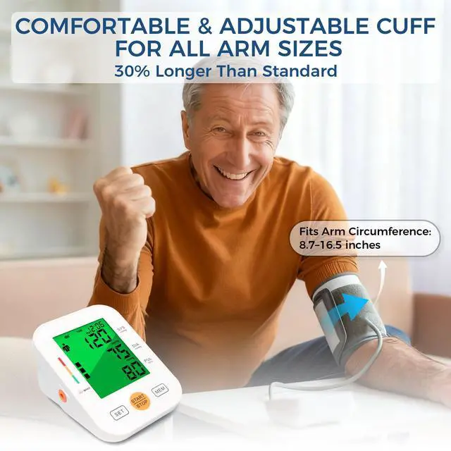 No more tight or uncomfortable cuffs. Our extra-long arm cuff adjusts up to 16.5 inches, offering a secure and comfortable fit for bigger arms. Designed for all body types, it makes blood pressure monitoring simple and hassle-free—for everyone in the family.