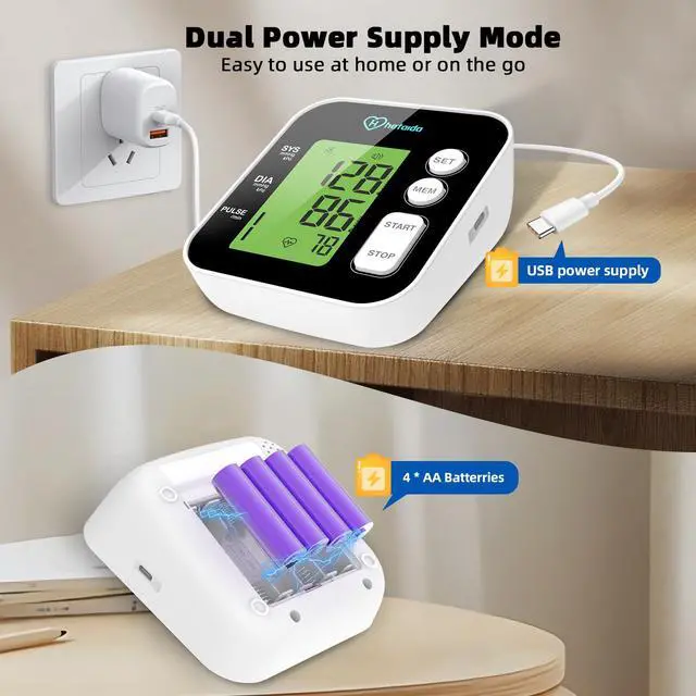 Blood pressure machine for home use with 4 AA batteries and external USB adapter power supply modes. Flexible options to save battery life.