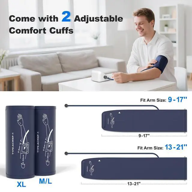 Designed with a longer cuff M/L cuff(9"-17") and X-Large cuff(13"-21"), the blood pressure cuff fits users in different shapes. it is convenient to wear on your arm even with one hand.