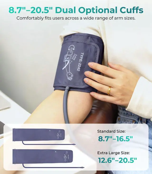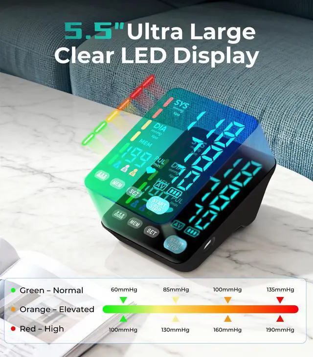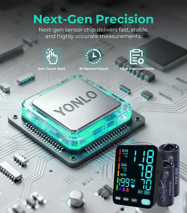 YONLO Blood Pressure Monitor Fast & Accurate BP Measurement The YONLO blood pressure monitors offers accurate readings in just 35 seconds with its upgraded measurement technology. It includes dual adjustable blood pressure cuffs (9-17 inches & 13-21 inches) for a perfect fit, ensuring comfort and precision for all arm sizes. The large LED display features a color-coded light bar (green for normal, orange for moderate, red for high) to make it easy to understand your blood pressure results. With 3*199 memory groups, its ideal for blood pressure monitors for home use, letting multiple users track their health over time. Please read the user manual before first use to ensure accurate measurements. Feel free to contact us anytime for assistance!