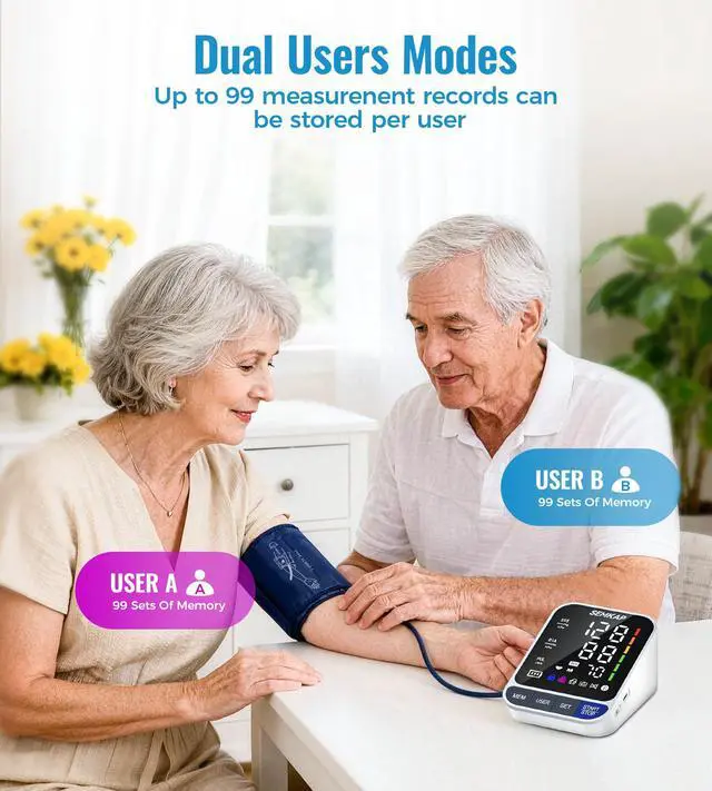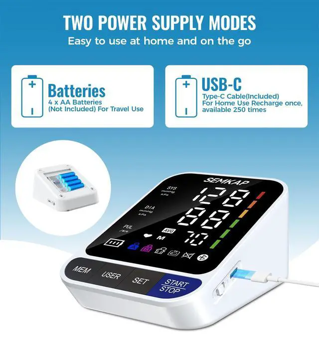 TRACK YOUR HEALTH WITH 2x99 MEMORY GROUPS:2 x 99 memory and 2 users mode, Automatic record the measurement results of each user, Help you clear track the health of parents or working parents.we are also equipped with a DC to USB cable and 4 AAA Batteries(not included). Two power options allow you to use our bp monitor anywhere, anytime, without worrying about power supply problems that prevent you from using it.
