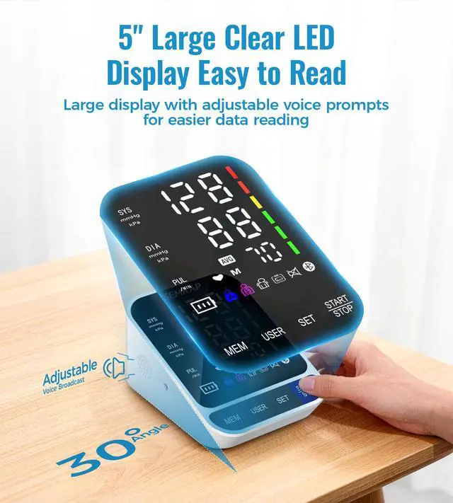 LARGE LED DISPLAY AND BUTTONS: Blood pressure monitors for home use features a large, with 5-inch LED display, designed with oversized numbers and large buttons to offer more quicker and more comfortable blood pressure measurement experience and get clearer results. Adjustable voice announcements.