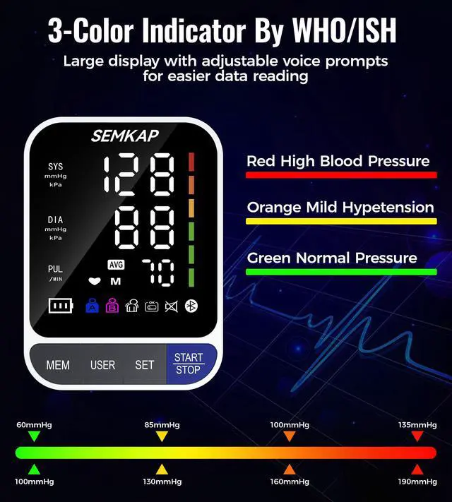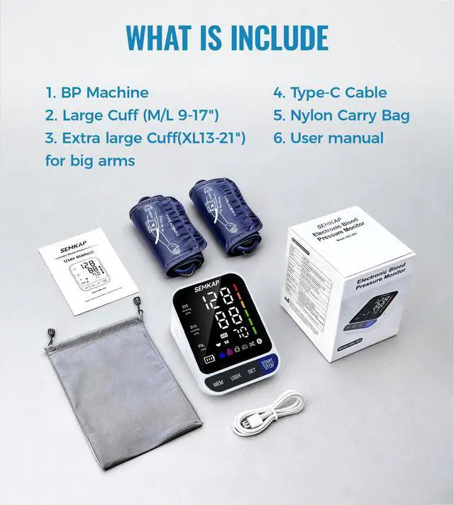ONE PRESS EASY OPERATION: SEMKAP blood pressure monitor is equipped with an upgraded precision chip and advanced measurement technology to deliver stable, reliable readings every time. This blood pressure machine is simple to operate, just press theStart button and get accurate results in as little as 30 seconds, ideal for daily home monitoring.