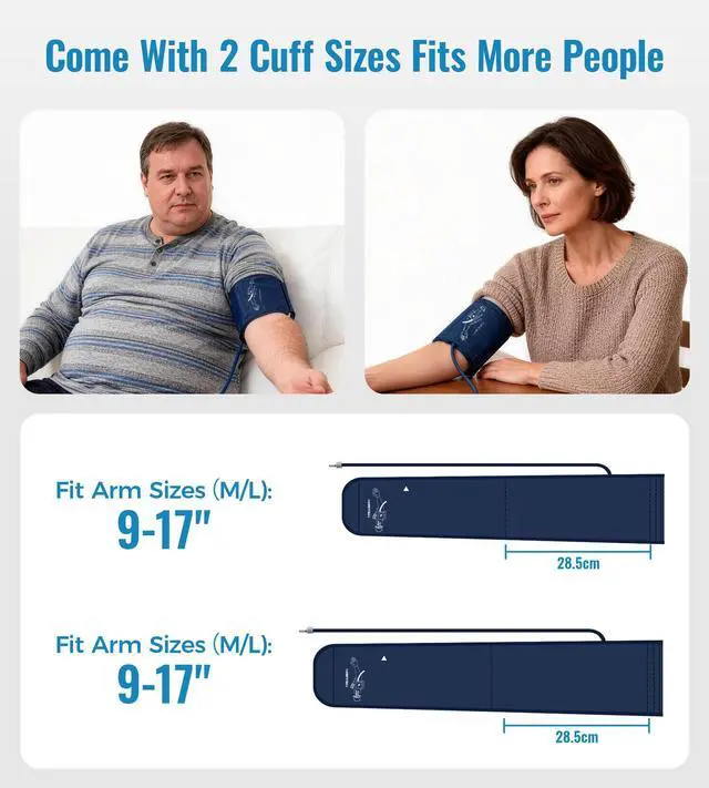DUAL CUFF SIZES FOR THE PERFECT FIT: Designed with a dual-size blood pressure cuff system, M/L cuff (9"-17") and XL cuffs (13"-21") are included in the package. Suitable for most arm sizes in the family. Adjustable cuff design for minimizing the tension when measuring blood pressure. Updated inflation technology for faster reading for large arms.