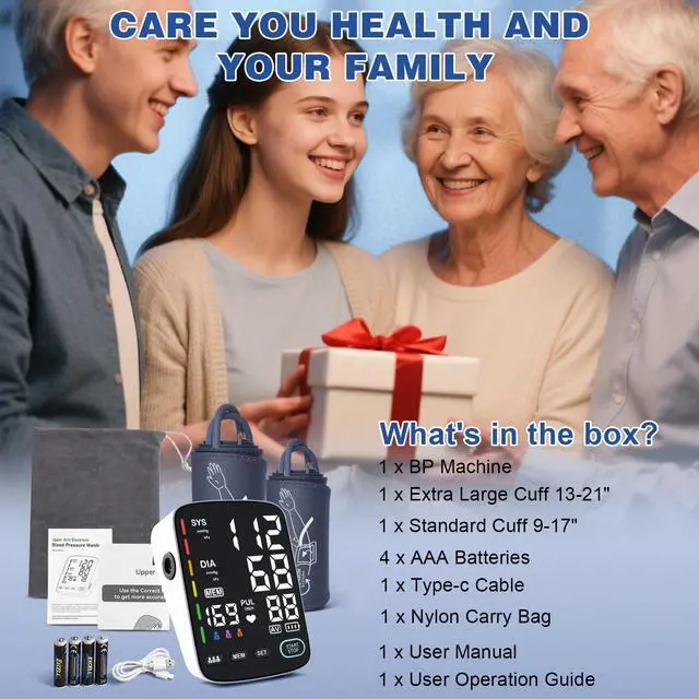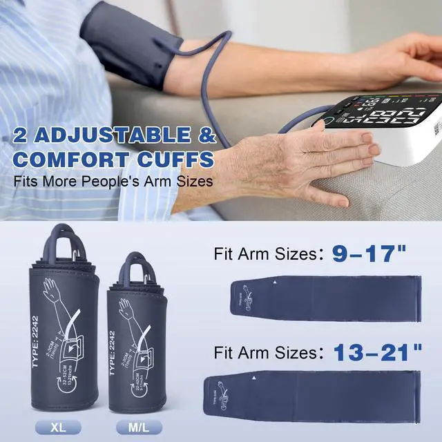 Both cuffs-better for all people-blood pressure monitor with comfortable adjustable 9" to 17" and 13-21" circumference for standard and large adult arms, suitable for different people in the family. The home blood pressure monitor automatically detects the correct position through the cuff and reminds you of the correct testing position.