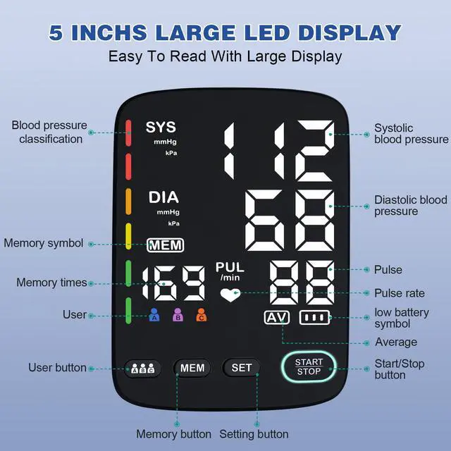 Large LED Display and Buttons - The blood pressure machine upper arm uses a large, bright 5-inch backlit LED display designed with a 45°angle and for clear, oversized numbers and large buttons to clearly display the interface and optimize viewing. One-button start operation makes it easy to use.
