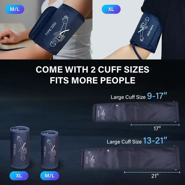 2.Dual-Size Cuff Design Standard cuff(22-42cm): Fits most adult arms Large cuff (32-52cm): Comfortable fit for special body types