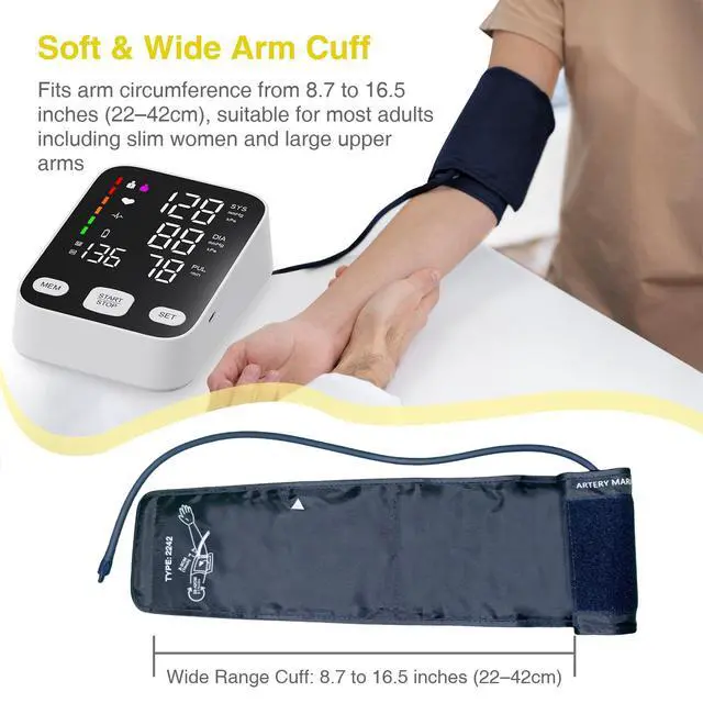 Our cuff is suitable for arm circumferences of 22-42 cm (9-16.5 inches), making it suitable for most adults
