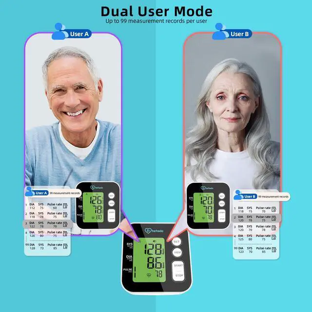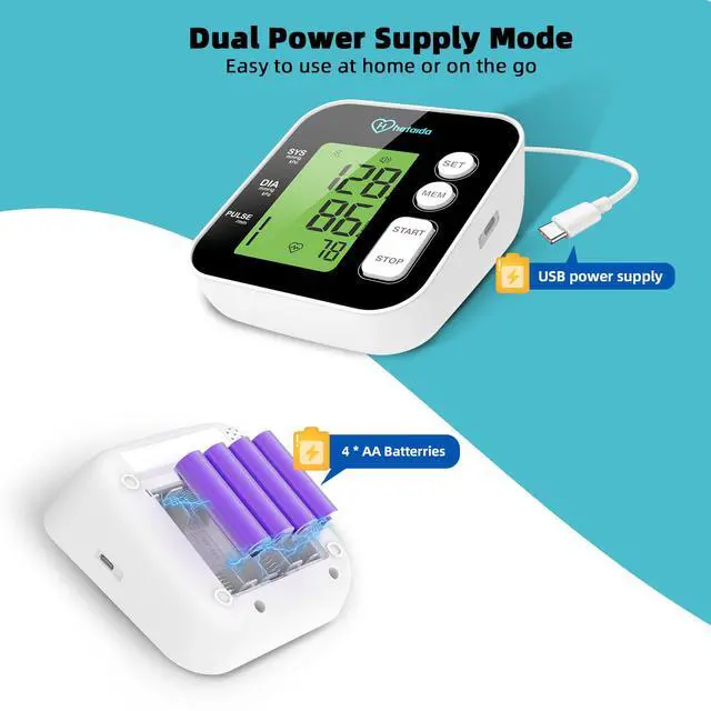 Powered by USB cable or batteries for flexible daily use. Stores up to 2 users readings automatically, making it ideal for couples or family health tracking.