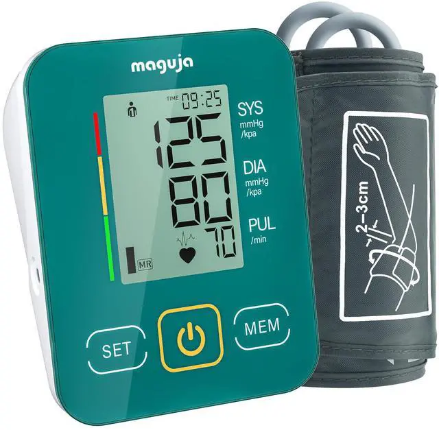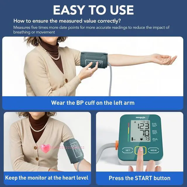 Maguja Arm Blood Pressure Monitor accurately track your systolic/diastolic blood pressure and pulse rate daily by one push button. Keeping track your blood pressure with date and time stamp easily at home.