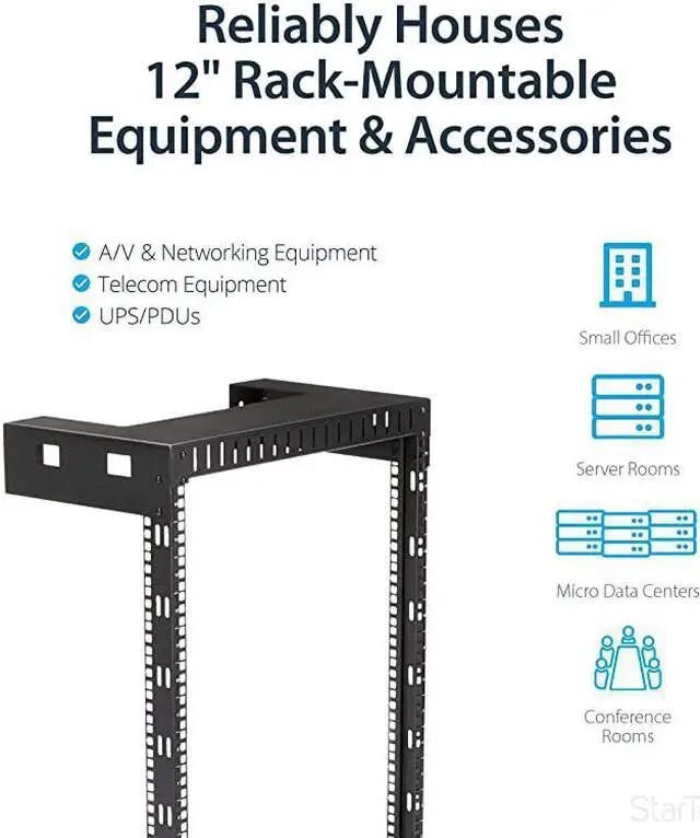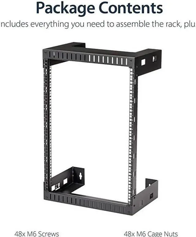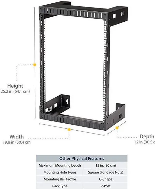 Style: 12in DepthThis 2-post open frame wall mount server room rack provides 15U of storage, allowing you to save space and stay organized. The equipment rack can hold up to 198 lb. (90 kg) and has a total product height of 30.5 in [ 77.5 cm]. The network equipment rack has a depth of 12 ( 30.4 cm), so its perfect for smaller spaces. Can be used to store home servers, patch panels and switches. Its easy to assemble and features mounting holes that are spaced 16 in. apart, making it suitable for mounting on almost any wall, based on common wall-frame stud spacing. The wall mount rack comes in a flat-pack making it easy to transport and reducing your cost in shipping. The wall mount rack cabinet also ships complete with all the M6 screws and cage nuts required to mount your equipment, saving the expense of purchasing them separately. You can mount the open-frame rack where space is limited, such as on a server room wall, office, or above a doorway, to expand your workspace and ensure your media/IT equipment is easy to access.