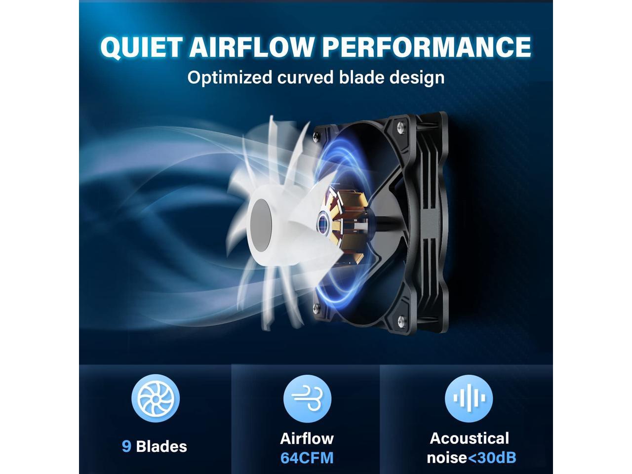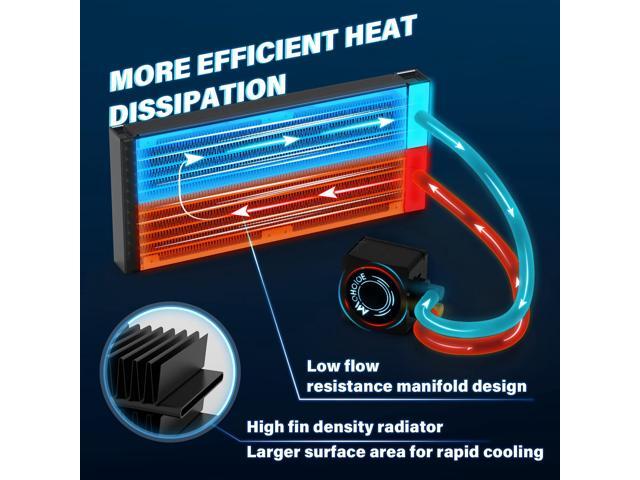 - Ultimate AIO Design and better Cooling performance: The high fin density radiator in the all-in-one liquid cooling system increases the surface area and the high-performance copper base plate accelerates the heat conductivity; Both designs accelerate heat conductivity making for highly efficient cooling; Meanwhile, the AIO 2*120 mm PWM fans peak airflow of up to 64CFM; Professional cooling technology increase CPU performance and lower temperatures as you improve and enhance your PC’s aesthetics