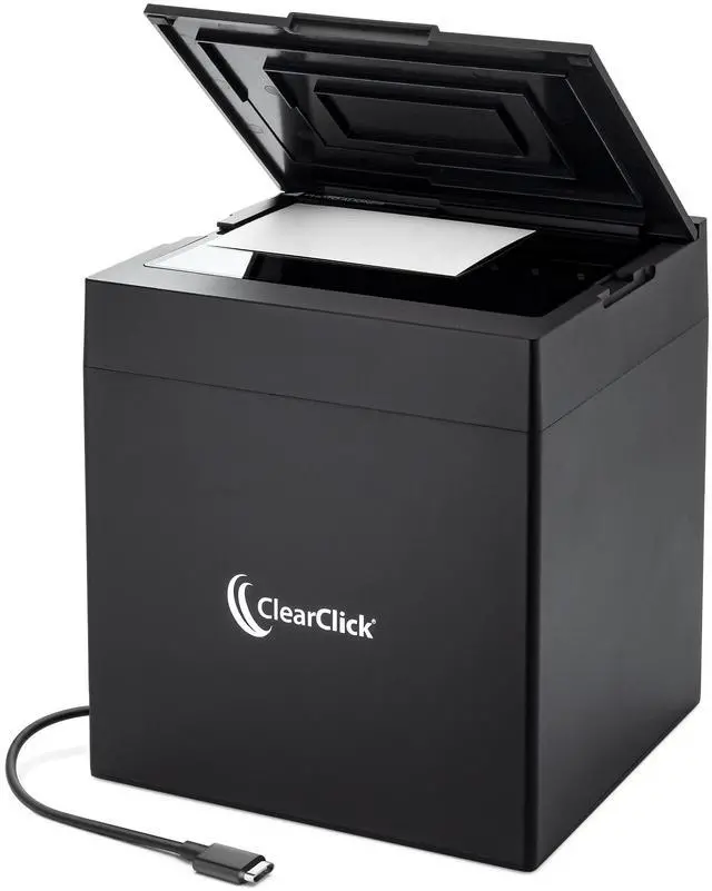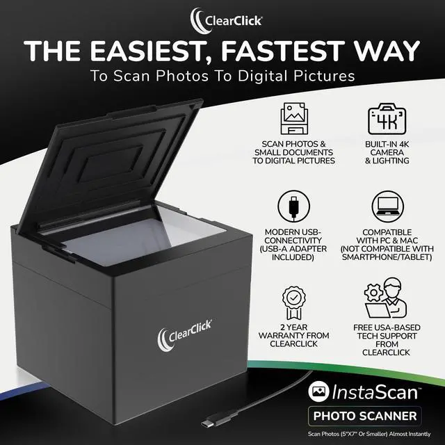 Unlike most conventional scanners, the ClearClick InstaScan has a built-in 4K camera and internal lighting that is optimized for photo scanning.