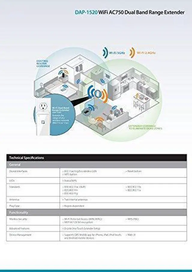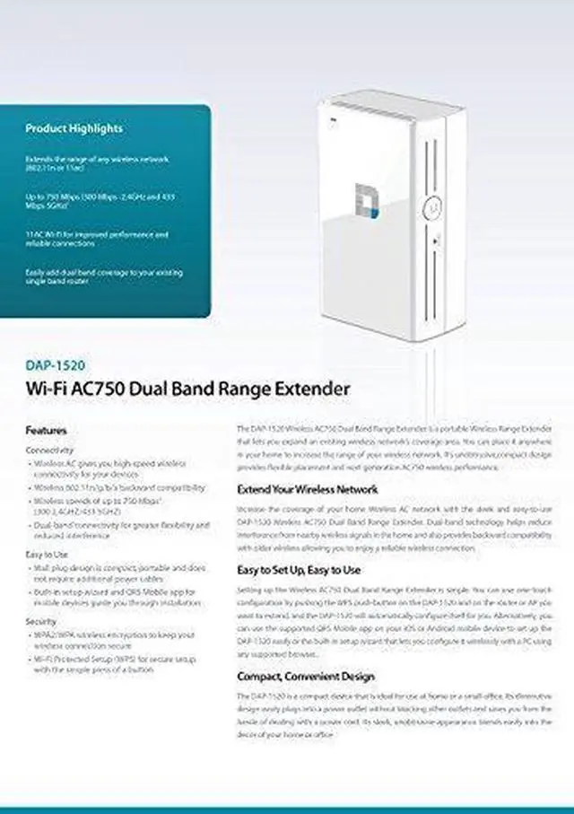Brand: D-LinkColor: WhiteFeatures: Extend the coverage of your home's existing wireless networkUp to 750 Mbps (300 Mbps -2.4GHz and 433 Mbps - 5GHz)High-speed wireless AC connectivity for your laptops smartphones and tabletsEasily add dual band coverage to your existing single band routerCompatible with any wireless router brandWall plug design is compact portable and does not require additional power cablesWPA2/WPA wireless encryption to keep your wireless connection secureWi-Fi Protected Setup (WPS) for secure setup with the simple press of a buttonLegal Disclaimer: VERY GOOD CONDITION. ORIGINAL RETAIL BOX. INCLUDES: * 1 WIRELESS AC1750 DUAL BAND RANGE EXTENDER * QUICK INSTALL GUIDE * WiFi CONFIGURATION CARD *Platform: No Operating SystemPublisher: D-Link Systems Inc.Warranty: Comes with Manufacturer Warranty.Details: Eliminate dead zones and extend the range of your home Wi-Fi coverage with the sleek and easy-to-use D-Link Wi-Fi AC750 Dual Band Range Extender (DAP-1520). With AC750 performance the DAP-1520 provides bandwidth up to 300Mbps on the 2.4Ghz and 433Mbps on the 5GHz bands. In addition the D-Link DAP-1520 adds the faster more reliable 5Ghz band to an existing signal band (2.4Ghz) network for improved performance and less interference. Dual-band technology helps reduce interference from nearby wireless signals and the next generation 11AC Wi-Fi provides backward compatibility with older wireless devices in your network allowing you to enjoy a blazing-fast reliable wireless connection.UPC: 675456777457EAN: 0163121538033