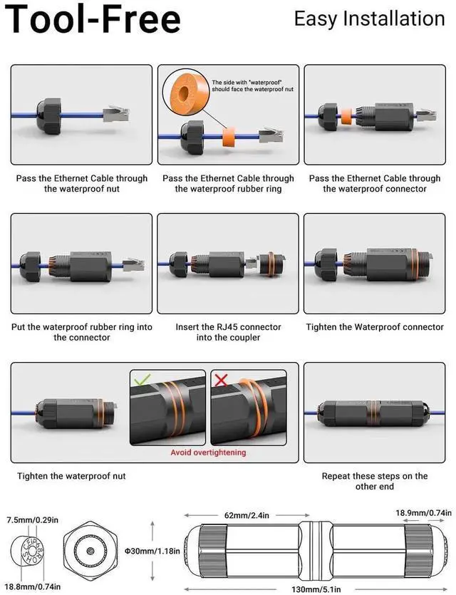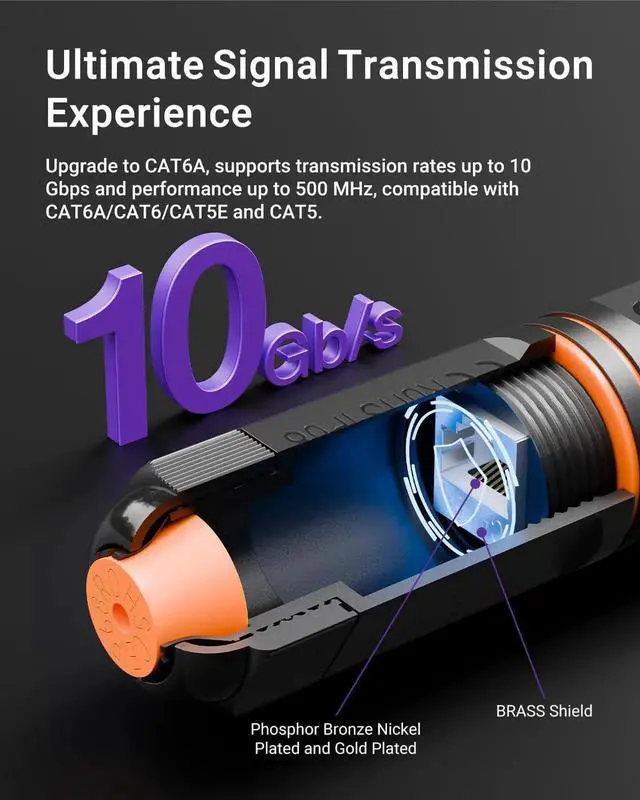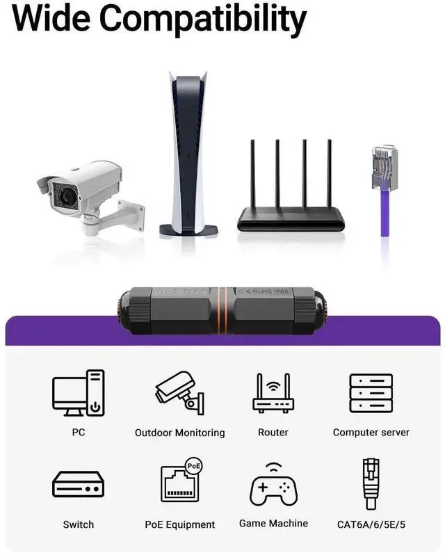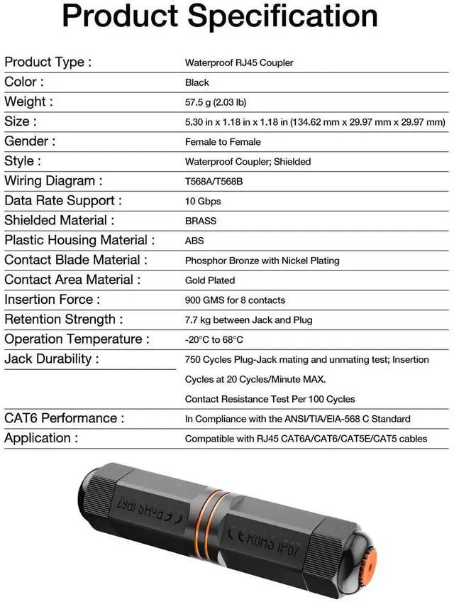 cat 6a coupler female to female is designed to expand your network in harsh outdoor environments. This IP68 level rj45 outdoor connector can connect two RJ45 cables, allowing for reliable and secure network extension in conditions exposed to water, dust, and extreme temperatures. Suitable for 10 Gigabit up to 100 m (328 feet), this coupler is well-suited for CAT6A/CAT6/CAT5E/CAT5 and compatible with 22 to 26 AWG solid and stranded copper conductors, perfect for outdoor installation, such as networked security cameras, streetlights, LED lighting devices and other Ethernet-based devices. Gold-plated contacts and metal shielding deliver 500 MHz and 10 Gbps speed, even in the harshest conditions. The installation of this ethernet coupler outdoor is a breeze and allows for easy installation without disassembly, facilitating a hassle-free setup that saves time and labor. Once installed, you can enjoy a long-term, maintenance-free connection with peace of mind. Just be mindful not to over-tighten, as it may reduce its effectiveness.