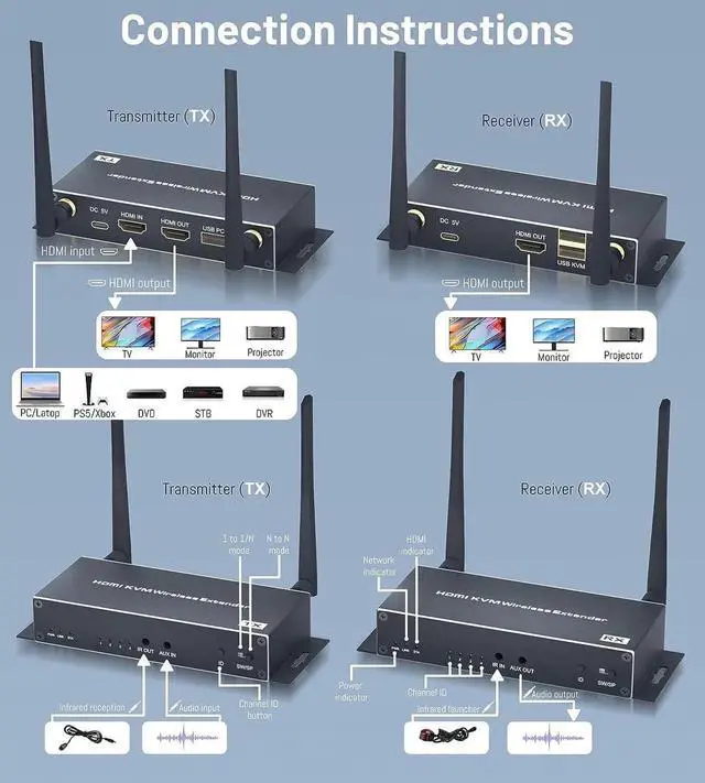 KVM FUNCTION & IR REMOTE- Compared with the previous version, this wireless HDMI extender can streamline your entertainment center by the KVM and IR remote function. You can connect a keyboard and mouse for TV, remote control your laptop which is on the TX side. You can use your remote control to switch the channel for cable boxes, media players, etc.