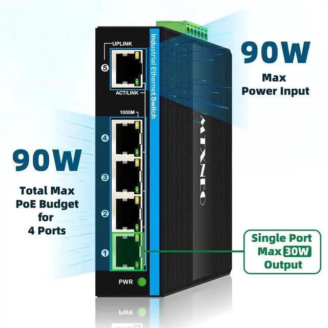BT90W PoE EXTENDER: Port 5 supports PoE IEEE802.3 BT 90W max input and can work with PoE switches or injectors. Port 1-4 supports PoE IEEE802.3 af/at output. One single port can reach 30W, and the total output power can be 90W ( if the input power or port 5 is 90W).