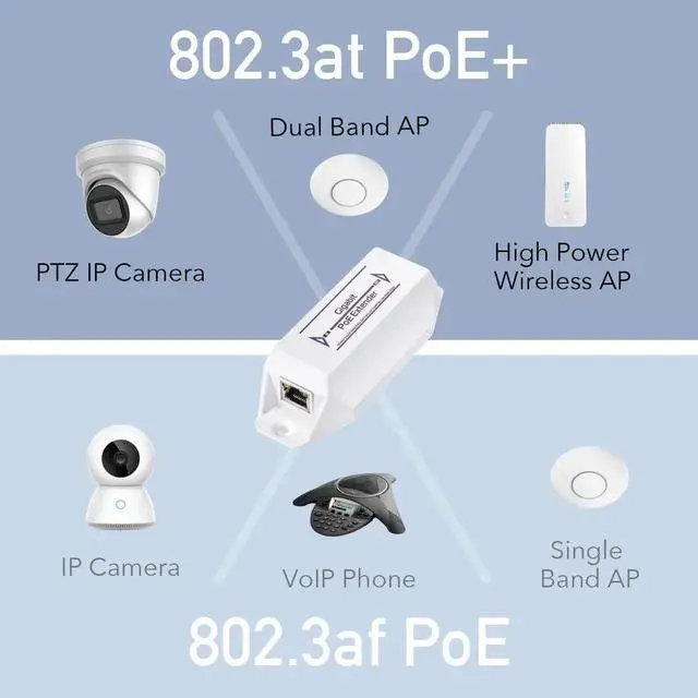 • Extends PoE / PoE + network connection to an additional 100m for a total distance of up to 200m from the PoE power source.