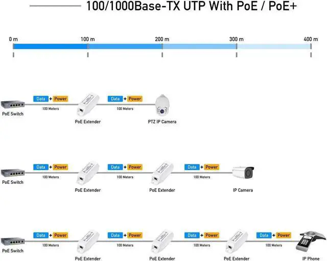 Extends PoE / PoE + network connection to an additional 100m for a total distance of up to 200m from the PoE power source.