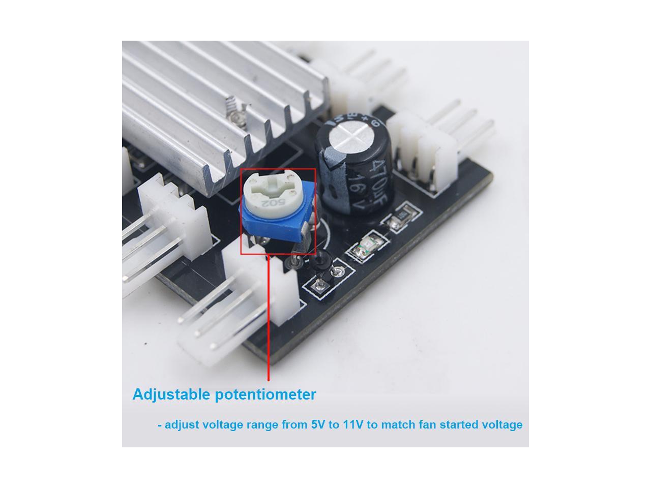 - Potentiometer adjust to match 5V~11V started voltage fans
