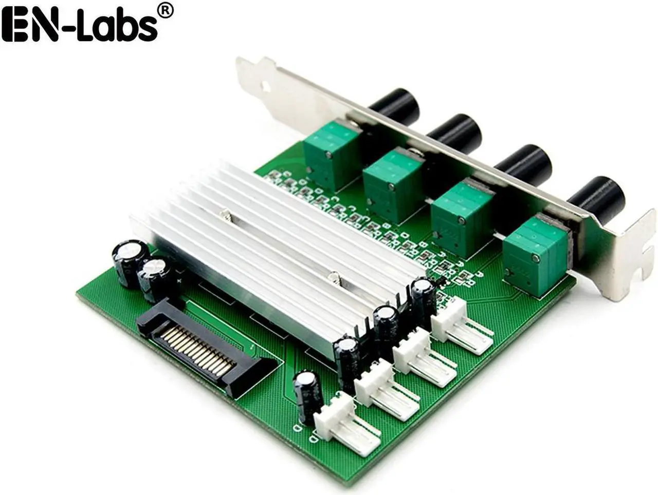 This controller is suitable for 12V CPU fan, chassis fan, video card fan, south bridge fan, north bridge fan, hard disk fan, server fan, inverter fan etc, all kinds of 3pin or 4pin fans. Increase speed to reduce computer part temperature when computer parts are busy. Reduce speed to reduce noise & power consumption when computer parts are free. Supports computer parts with cooling fan, like CPU, HDD, DDR, VGA, etc. Power by Molex 4pin female or SATA 15pin female Support 4 channels fan speed adjust individually Each channel can be turned off or adjusted to 100% full speed Adjustable knob available to adjust cooling fan revolution speed for each fan individually Each channel can control 4-pin fan, 3-pin fan(Just voltage adjustable control, NOT PWM CONTROL) Specification Fan Speed controller by knob from 0% to 100% full speed Support current 1A max each channel.