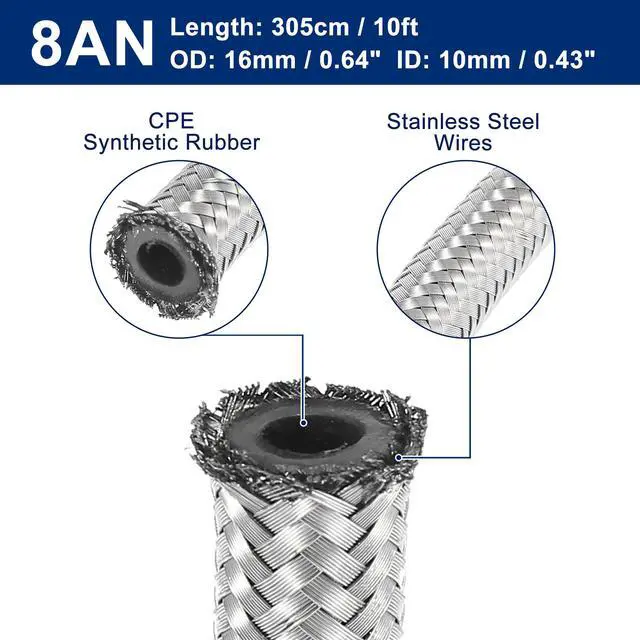 10 Ft 8AN Fuel Hose AN8 1/2" Universal Braided Stainless Steel CPE Oil Fuel Gas Line Hose