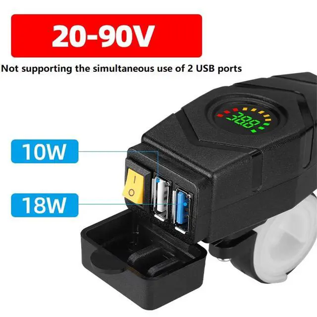 1. Electric charger, with an input of 20V-90V, Do not allow two devices to charge simultaneously, supports QC3.0 fast charging, intelligently adjusts the output, and does not damage the