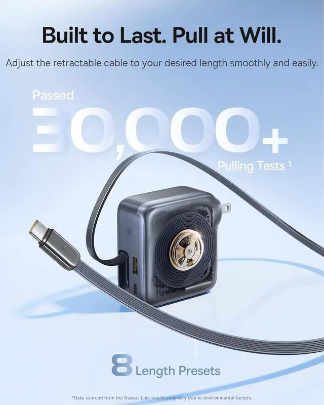 Durable Built-in USB-C Cable: The 2.6ft (80cm) retractable cable has been tested with 30,000 pulls and stretches, indicating that it can last about 5 years, will keep you ready whenever your phone or tablet needs a quick boost. It's the ideal charger to keep your travel light.