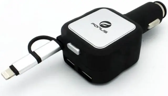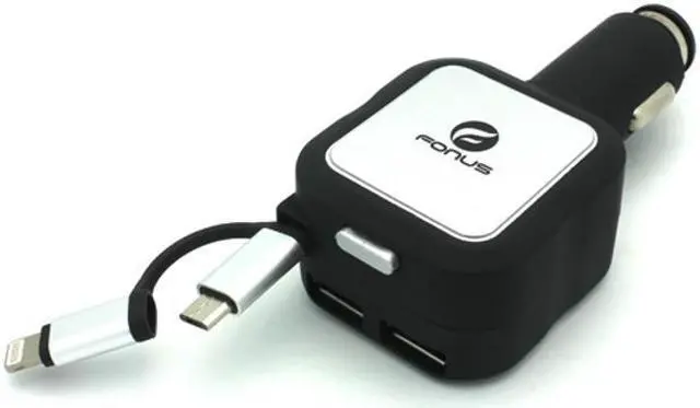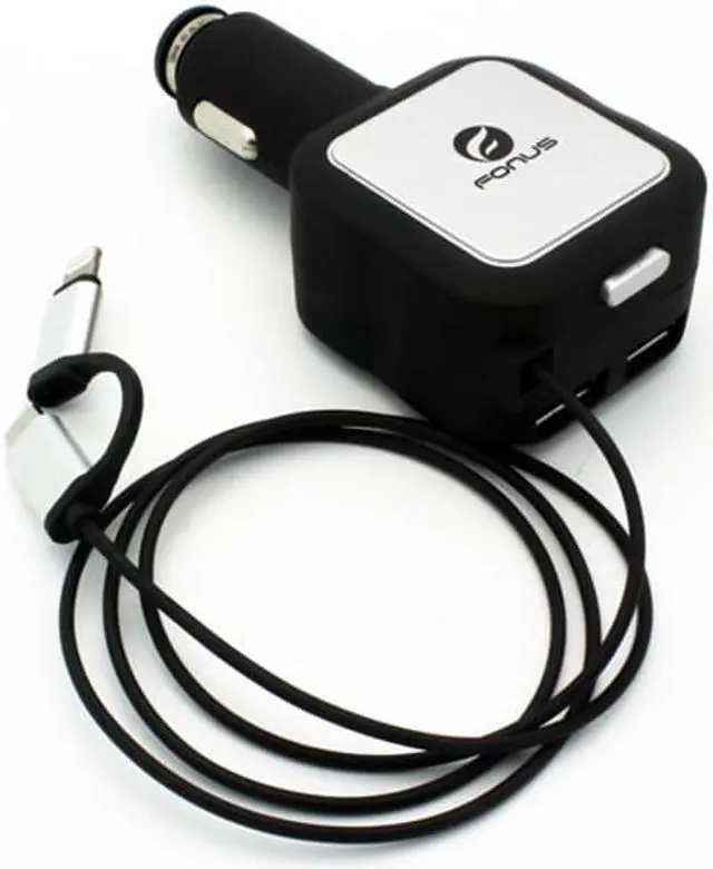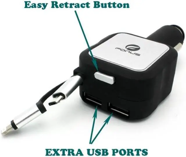 Fonus Retractable Car Charger with Extra 2 USB Ports has lots of features. With such a small design that is light weight and easy to carry around, the car dc charger will not take up extra room for its usage. The rubberized coating protects this device from slipping, which can cause damage to the product. To prevent from over heating and over charging, the IC chip prevents those situations from occurring. This great product allows non interrupted charging even while the phone is being used. You can see with all these great features found in this one low price car charger, it will be hard to find a better offer. Meanwhile, retract the cable with the easy to use button located on the top of the charger. Just press down to retract the full length of the cable. This cell phone charger keeps your cell phone powered up and eliminates wire tangles and mess. Powerful 4.8Amp output. MicroUSB and Lightning Connectors: You can use this charger for iPhones, iPads and Android Phones/Tablets with MicroUSB charging port.