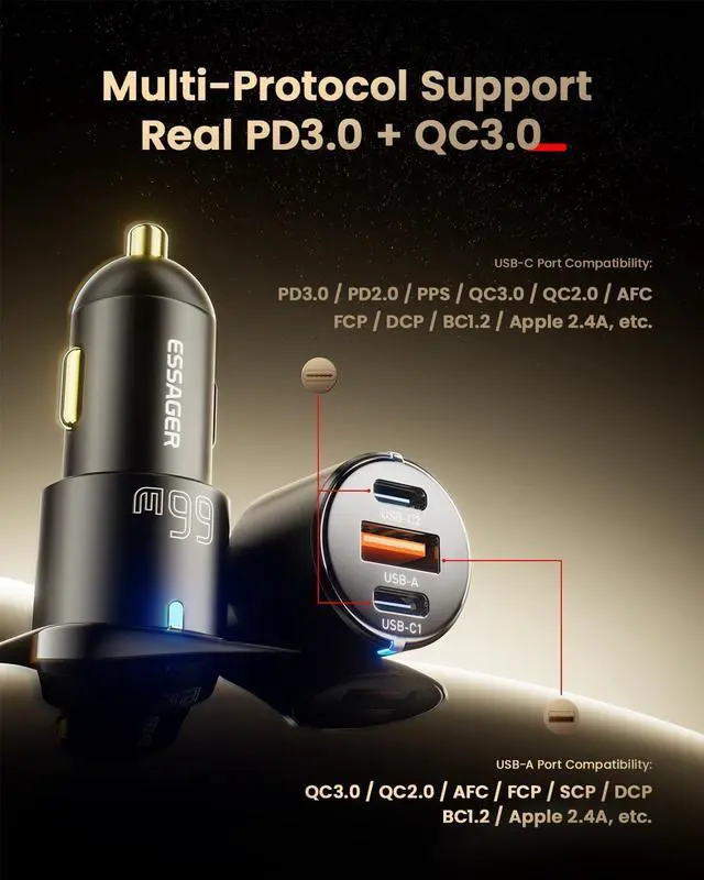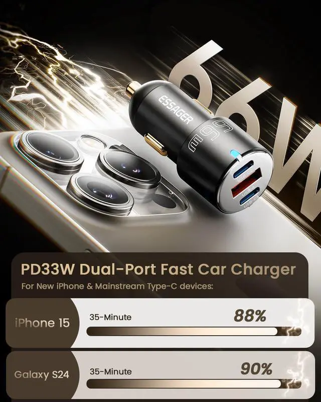 66W Fast Charging 66W fast USBC car charger supporting PD/PPS 33W(Max) and QC 30W(Max) high output, and can fast charging 3 devices simultaneously. Support charge for iPhone 15/14/13/12 series up to 88% and Galaxy S24/S23/S22 up to 90% in 35mins. Support PD3.0/PPS/QC3.0 charging protocol