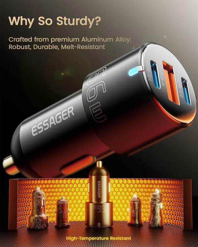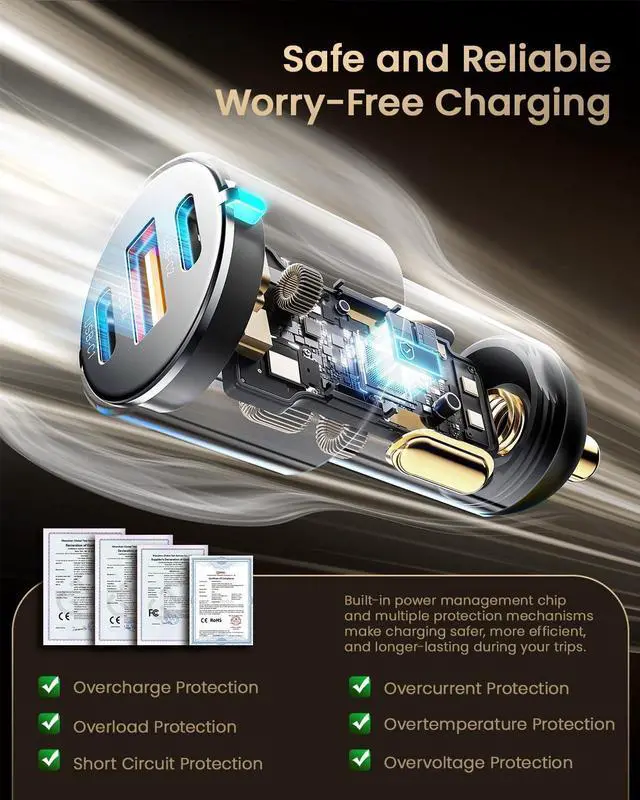 Safety Systems Our 66W car charger is equipped with intelligent control chipset, Full range provid temperature Protection, Over-Current, Over-voltage, Overcharge, Overload, Overheat and Short circuit. ensuring 100% for you and your device's protection