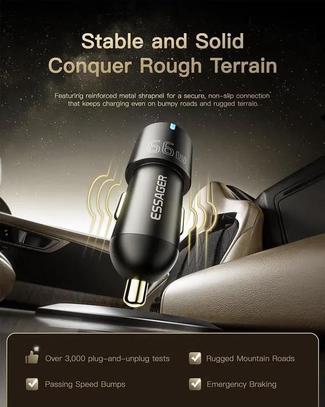 LED light and anti-fall When the car charger is charging,which will have LED light display,You don't need to struggle to find the charging port in the dark any more and the soft light increases the warm atmosphere in the car.On both sides of the charger we have strengthened the anti-slip shrapnel, and its gold plating, That is strong and durable, but also to ensure the efficient passage of currenteven if driving on uneven mountain reads,there will be no power failure