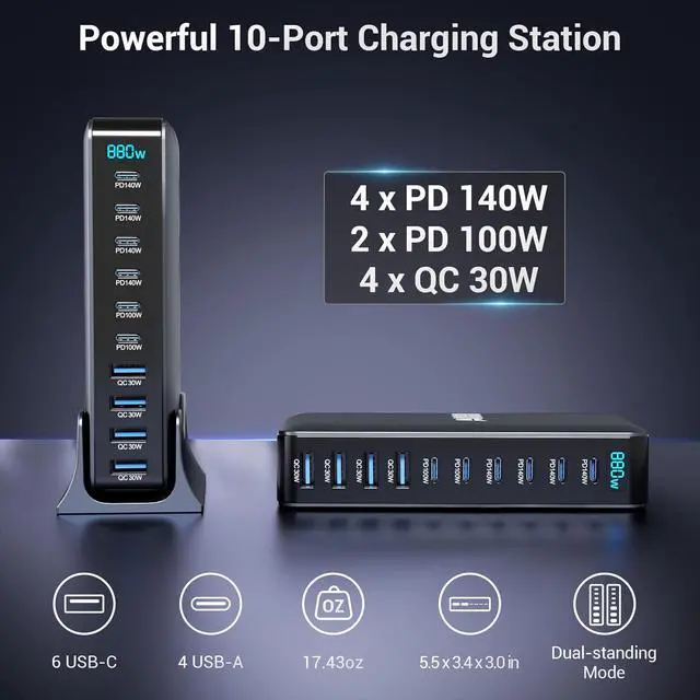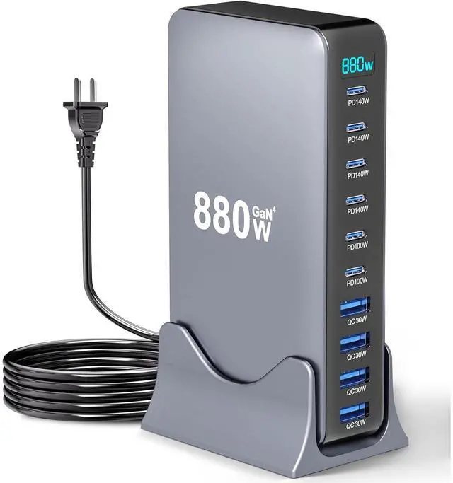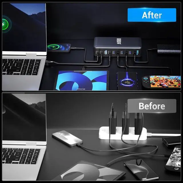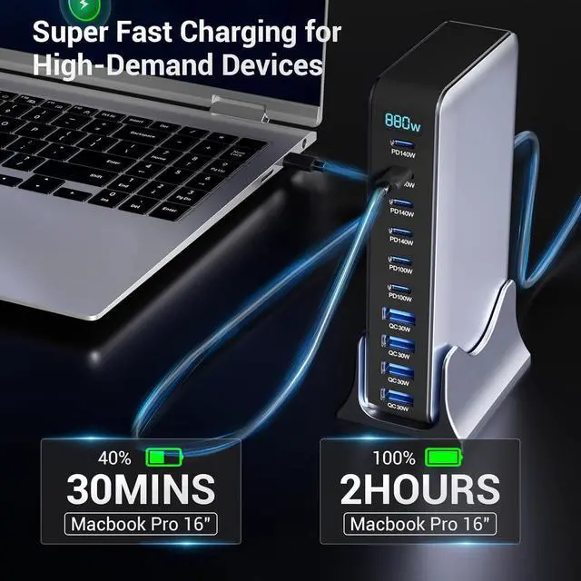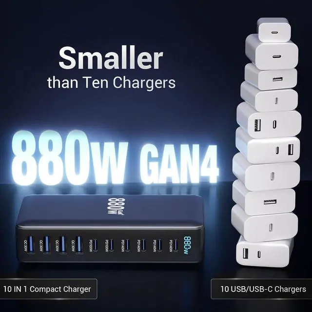 With one compact 880W USB C charging station, you can power every device -- laptops, tablets, phones, earbuds, even high-demand workstations -- without juggling multiple chargers.