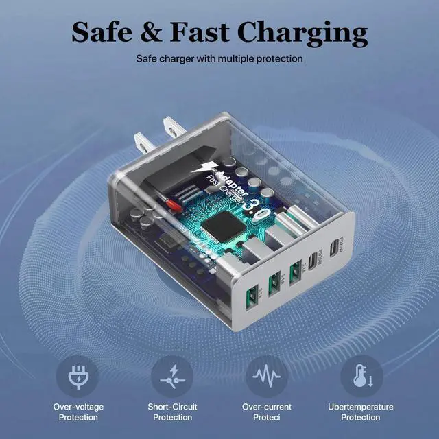 Safety & ReliabilityThe USB C charger is equipped with ABS + PC fireproof material, and there are multiple protection devices inside, protecting devices from overheating and overcurrent, overcharging and short circuit, which protects the safe use of your device.