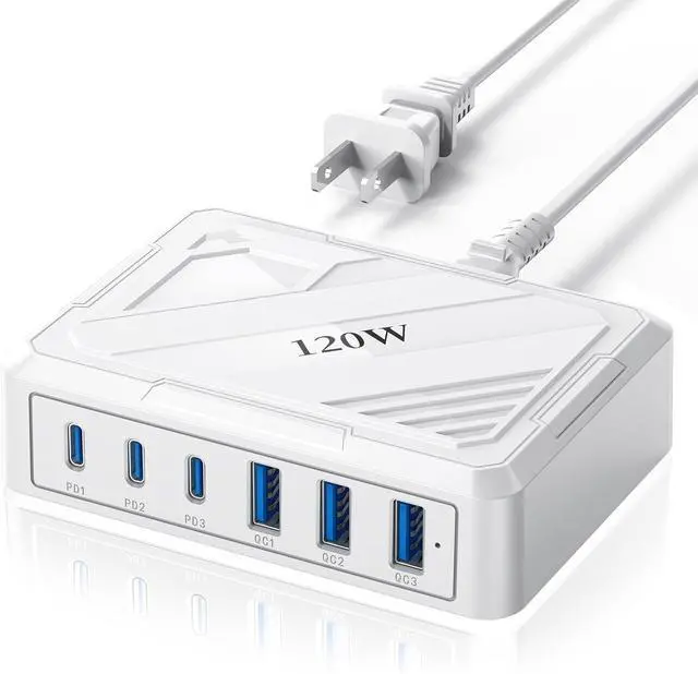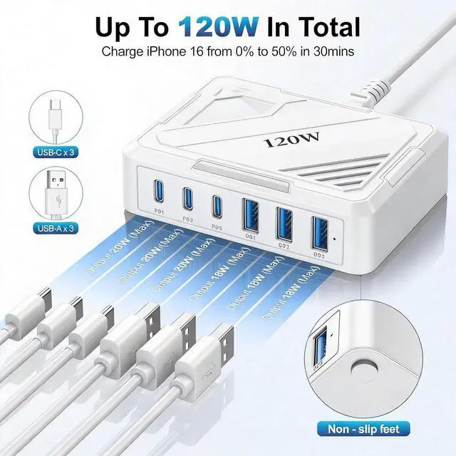 120w Total Power Output, 3 Usb-a Qc Ports, 3 Usb-c Pd Ports, Multiple Usb Ports, Quick Charge Compatible
