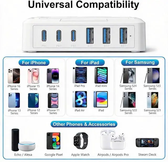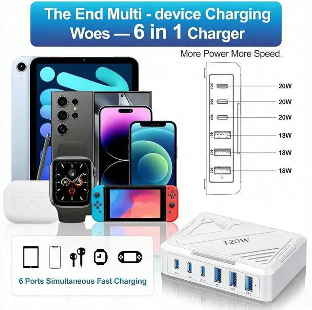 3 USB-PD and 3 USB-QC Ports Independently Charge 6 Devices at Once We are a true 120W charger, unlike most on the market with false advertising that causes speed reductions when multiple ports are used. Our USB-C charging station features 6 independent output ports, ensuring all devices can charge simultaneously at full speed without power sharing or disconnections. This 6-in-1 charging station reduces cable clutter and helps you create an organized, tidy desktop.