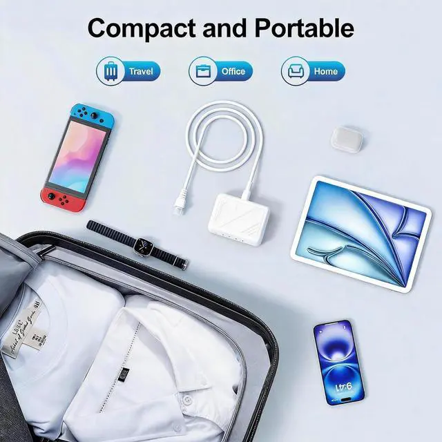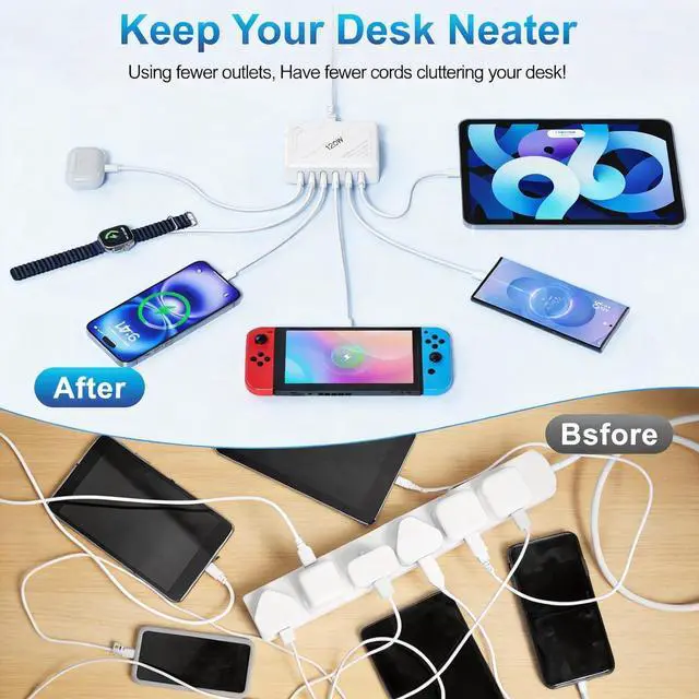 Portable USB-C Charging Station Compact and Travel-Friendly This multi-port USB-C charger station is perfect for charging multiple devices at home, in the office, or while traveling. Its compact size saves 50% of space and fits easily into a pocket, handbag, or suitcase. The included 5FT /1.5M power cord provides ample reach to desktops, nightstands, bedside tables, service counters, and more.