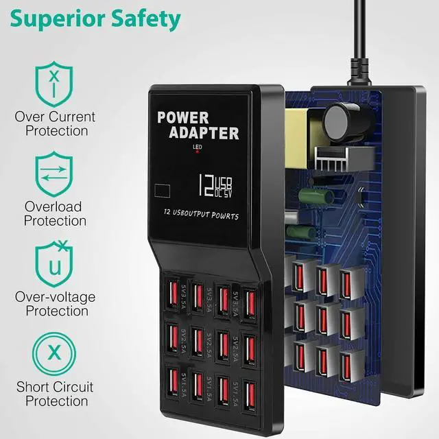 Charging Rapidly:With total 60watts and 12A output,The intelligent charging technology enables each USB port to recognize the devices plugged into and provide the fastest possible charging speed up to 3.5A. Save your time.
