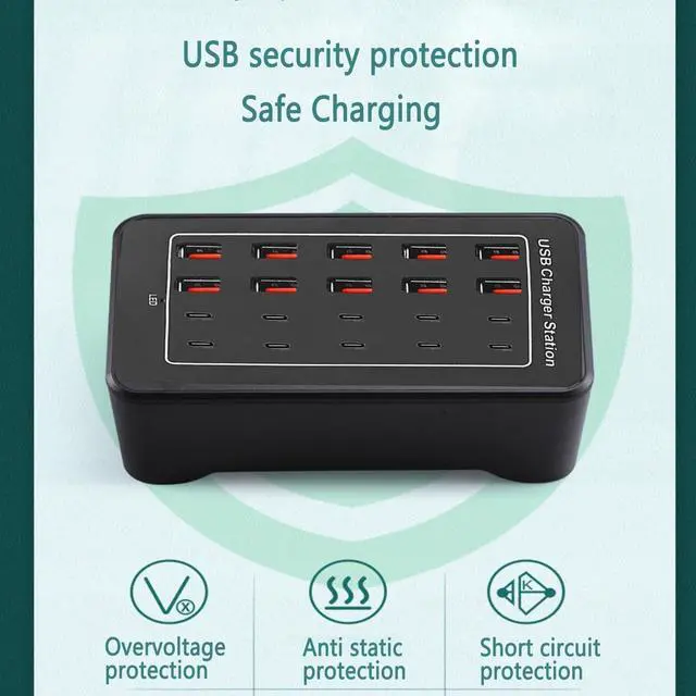 This usb charging station is overload, over-voltage, over-current, short circuit, overcharge, Voltage identification, temperature protection. Automatically detects and delivers the optimal charging current for connected devices, speeding charging time.