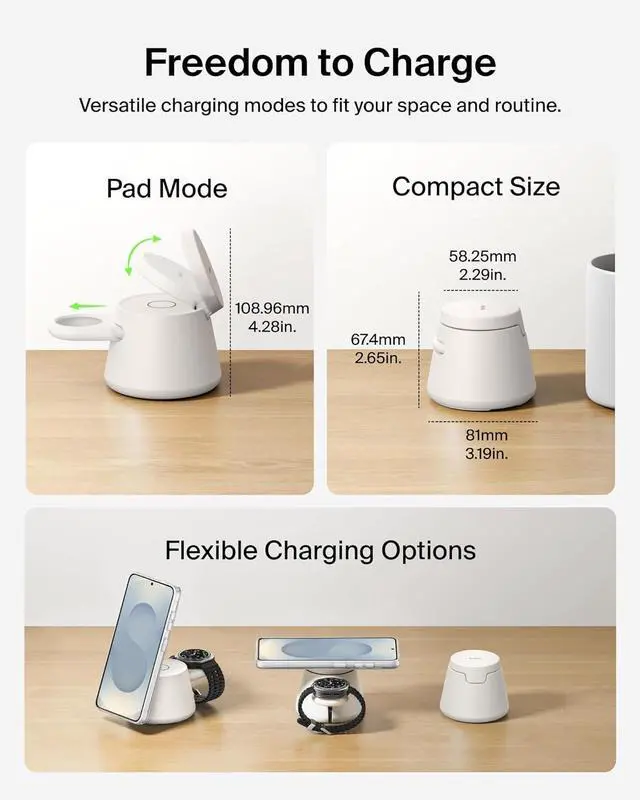COMPACT, CONVERTIBLE, PROTECTIVE: Adjustable and ultra-compact, it travels easily and converts from stand to pad mode. A collapsible watch holder folds away after use, while a non-slip base and soft-touch silicone protect your phone during charging.