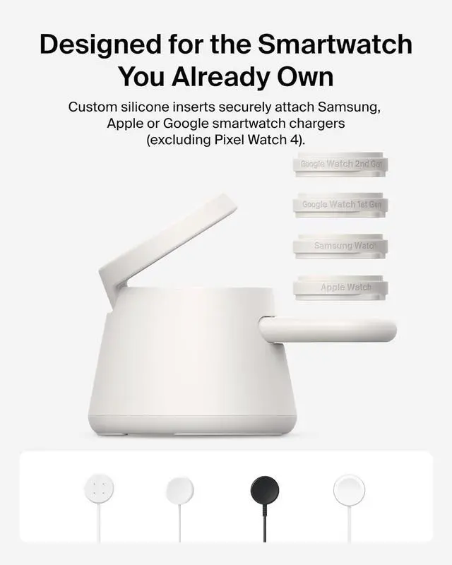 DESIGNED FOR YOUR SMARTWATCH: Comes with custom silicone inserts made for original Android and Apple smartwatch chargers (excluding Pixel Watch 4), including inserts for Apple Watch, Google Watch (1st and 2nd Gen), and Samsung Galaxy Watch.